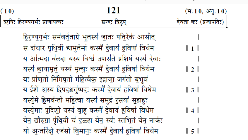 10.121.9: May he who is the father of earth protect us (1). He created the heaven, his law of being is Truth (2). He created the great delightful Waters (3). We worship that kasmai Deva -the Brahman