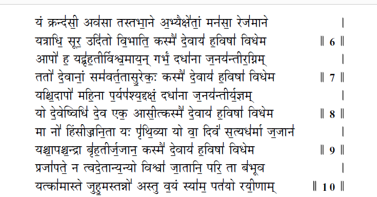 10.121.6: (The Heaven and Earth) which sound their thanks (krandasl) to him (yam, Prajapati) for his propping them up (tastabhane) and for his protection (1), and they look upto him gratefully by their illumined (rejamana) minds (2), while the sun, rising, brightly shines over them (3). We worship that kasmai Deva -the Brahman